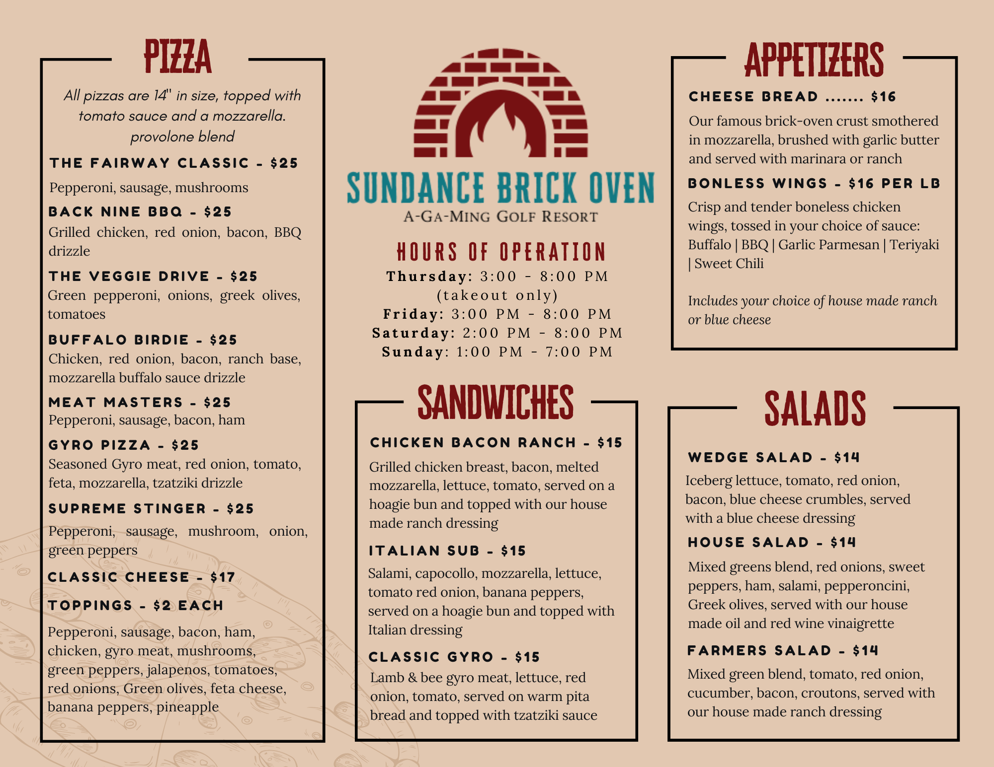 Located at the brand new Sundance and Torch pro shop, the Sundance Brick Oven offers pizza, hot sandwiches, to-go options, and a full bar. Stop by your new favorite A-Ga-Ming hang out and enjoy delicious, brick oven style pizza during the turn or after a long day on the course!